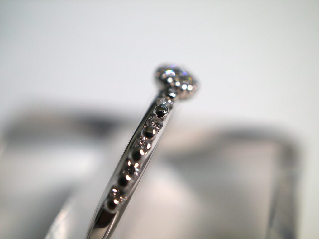 リングのアームには連なるように小粒のダイヤモンドをセッティングし、